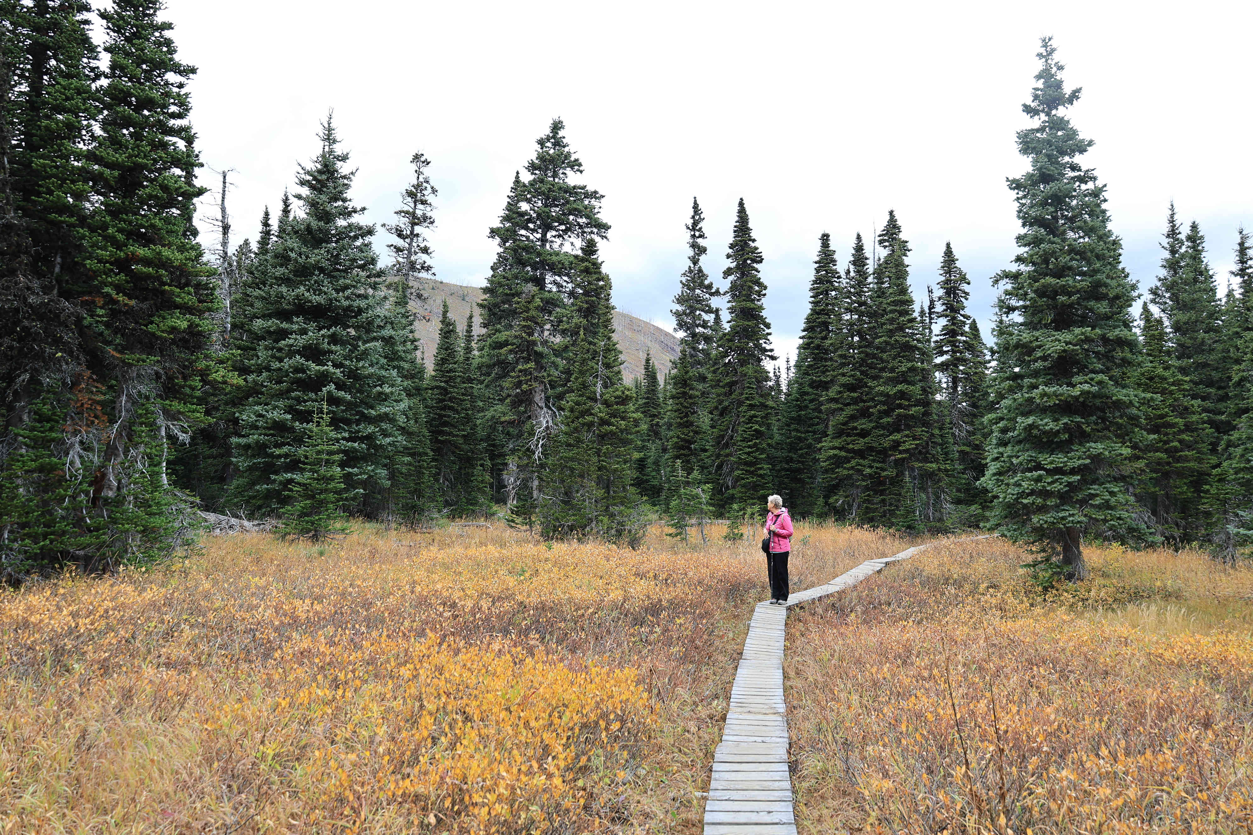 На горе напротив отеля «Принц Уэльский» есть смотровая площадка под названием "Медвежий горб" (Bear's Hump), откуда открываются фантастические виды на окрестности. Некоторые фото оттуда мы уже показали выше. Тропа туда, хоть и короткая (1,4 км в одну сторону), но крутая (подъём на 215 м). И вот однажды вечером мы туда отправились, и действительно, пришлось потрудиться! Но награда за усилия была достойная.