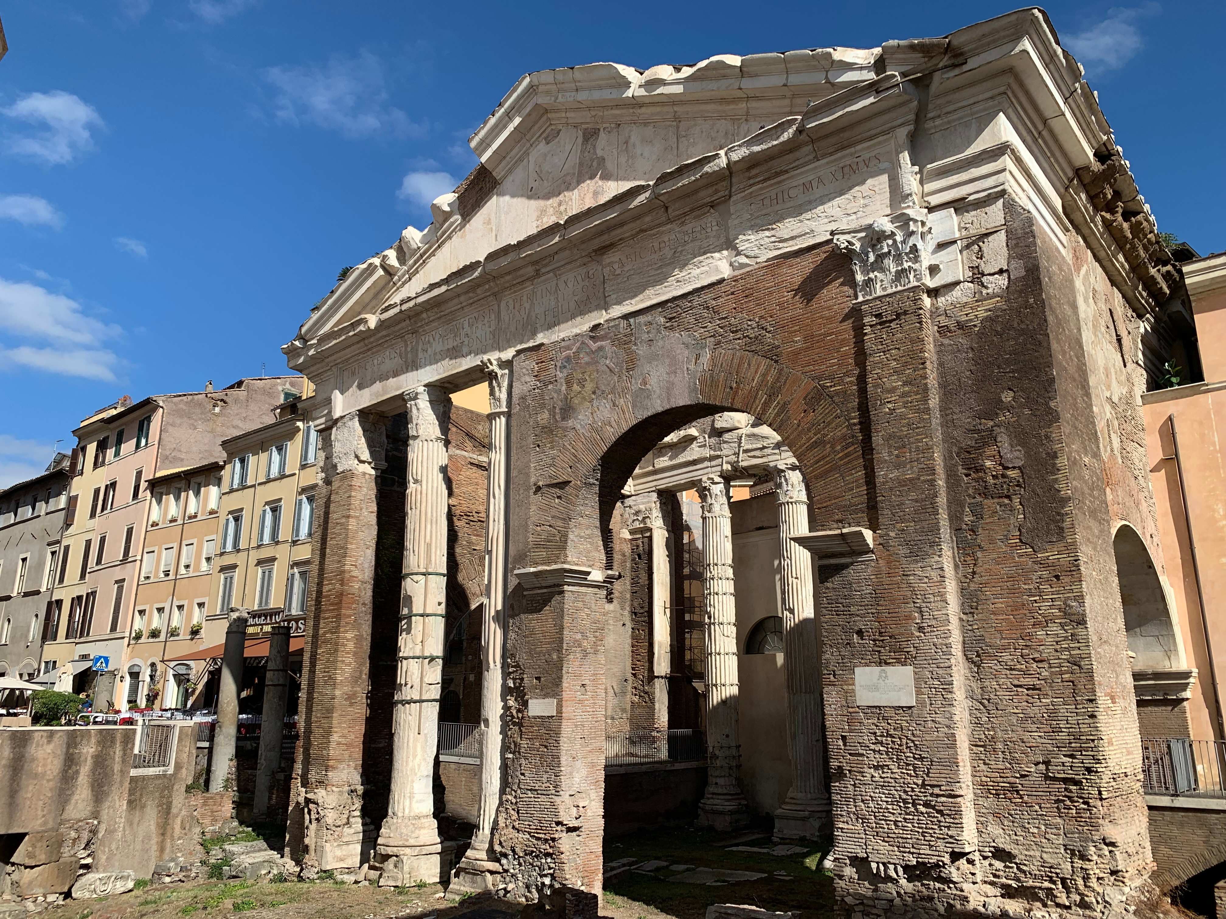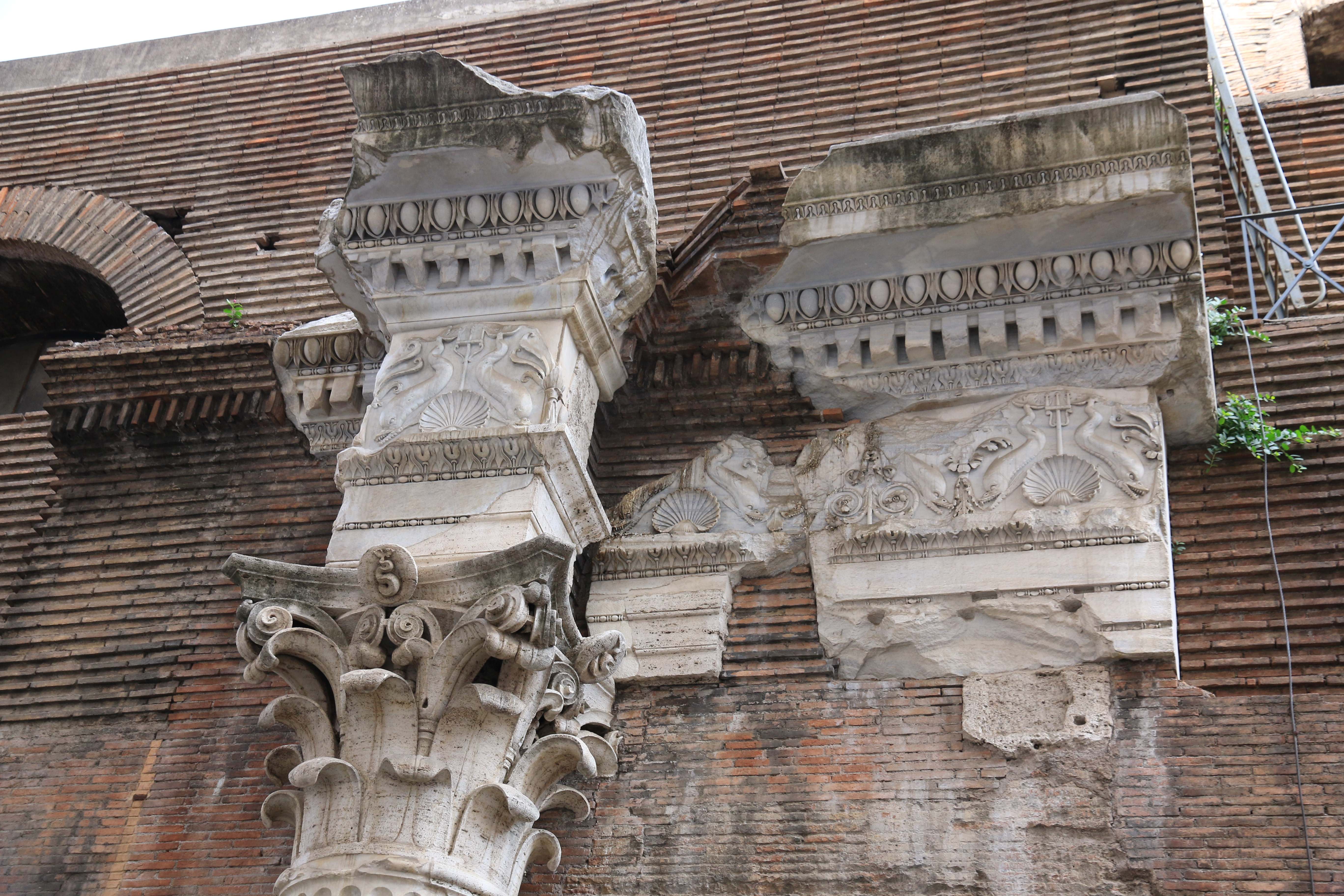 Другая интересная римская достопримечательность недалеко от Пантеона, на Пьяцца-ди-Пьетра - храм Адриана (точнее, одна стена от него), построенный в честь этого римского императора его приёмным сыном, тоже императором, Антонием Пием. От храма остались одиннадцать огромных мраморных колонн с коринфскими капителями, уходящими на глубину 5 метров - так вырос культурный слой с античных времён.