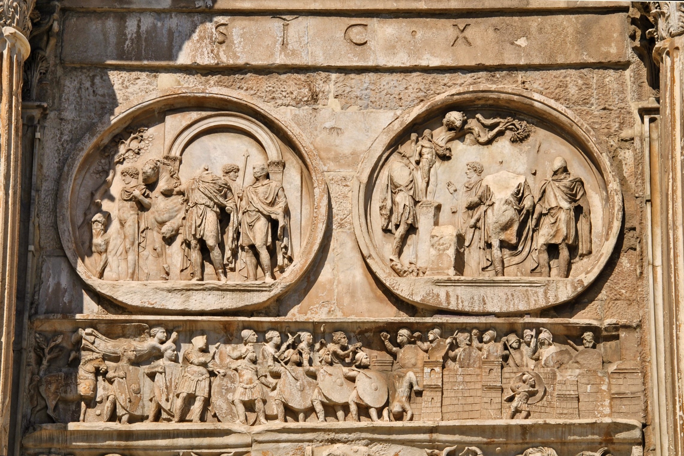 Под медальонами расположен длинный, идущий по всему периметру сооружения рельеф (фриз Константина), созданный уже в период возведения арки. Он отражает важнейшие события в первые 10 лет правления Константина: выступление его армии из Галлии в поход на Рим, покорение Северной Италии (включая захват хорошо укреплённой Вероны - на фото 3.7), победу в битве у Мульвиева моста над Максенцием и триумфальный вход в Рим.