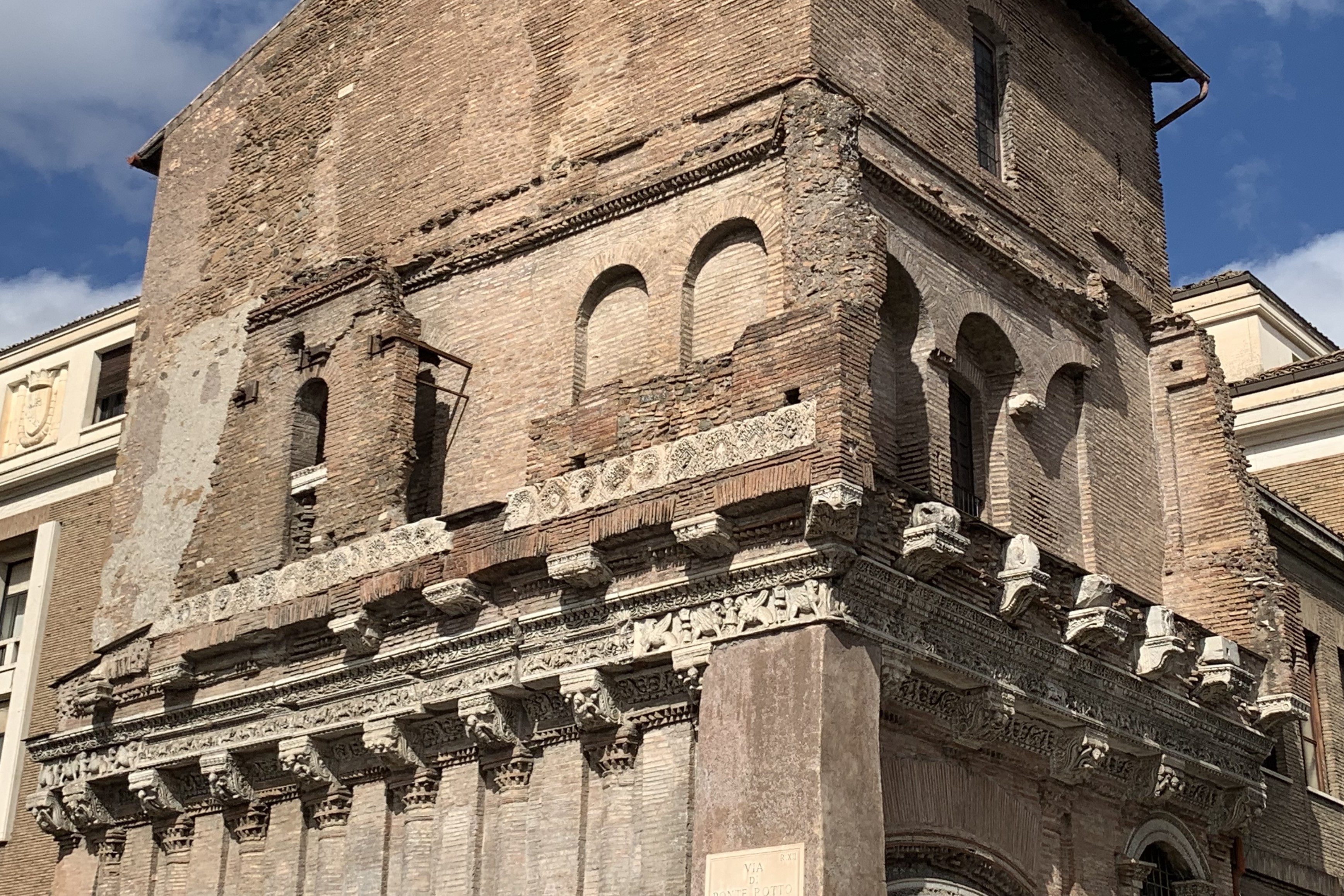 Если пройти дальше по дорожке вдоль театра Марцелла и в конце подняться вверх по ступенькам, попадаешь к римскому монументу под названием Портик Октавии. Собственно, это не портик (крытая колоннада), а только сохранившийся вход в него. Внутри портика находились два храма, фрагменты одного из них можно увидеть сквозь кирпичную арку. Император Август перестроил портик и посвятил его свой сестре Октавии, матери того самого Марцелла, в честь которого назван театр. Октавия, одна из самых влиятельных женщин римской истории, была вторым браком замужем за Марком Антонием, вначале союзником, а потом непримиримым врагом Августа.