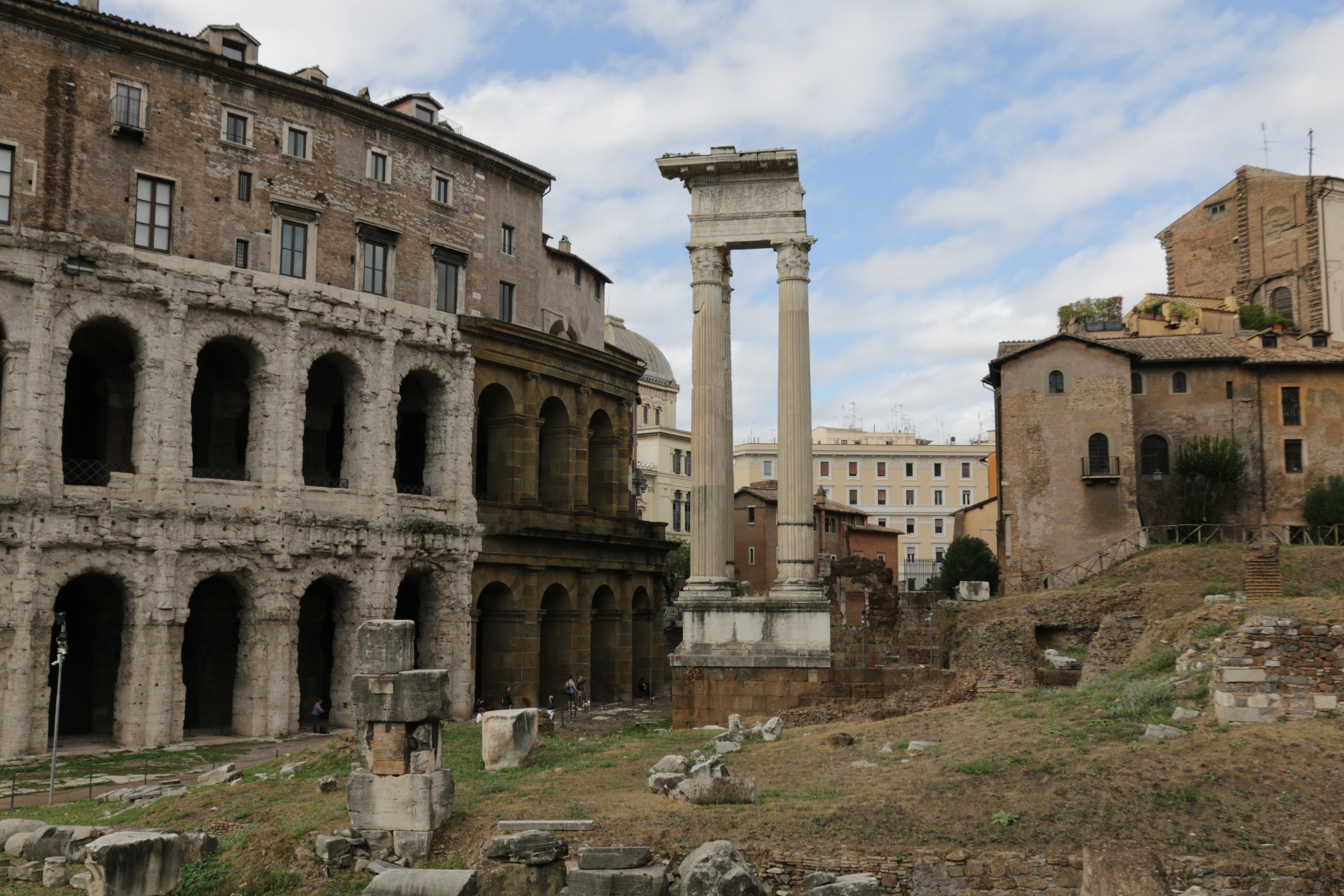 Рядом с театром Марцелла видны три стоящих колонны с коринфскими капителями - это остатки храма Аполлона Врачевателя (Apollo Medicus). Святилище Аполлона возникло здесь ещё в 5-м веке до н.э., в благодарность за избавление от эпидемии чумы. Другое название храма - Сосиев Аполлон (Apollo Sosianus), связано с политиком Гаем Сосием, который провёл его масштабную перестройку и реставрацию в 34-м году до н.э.