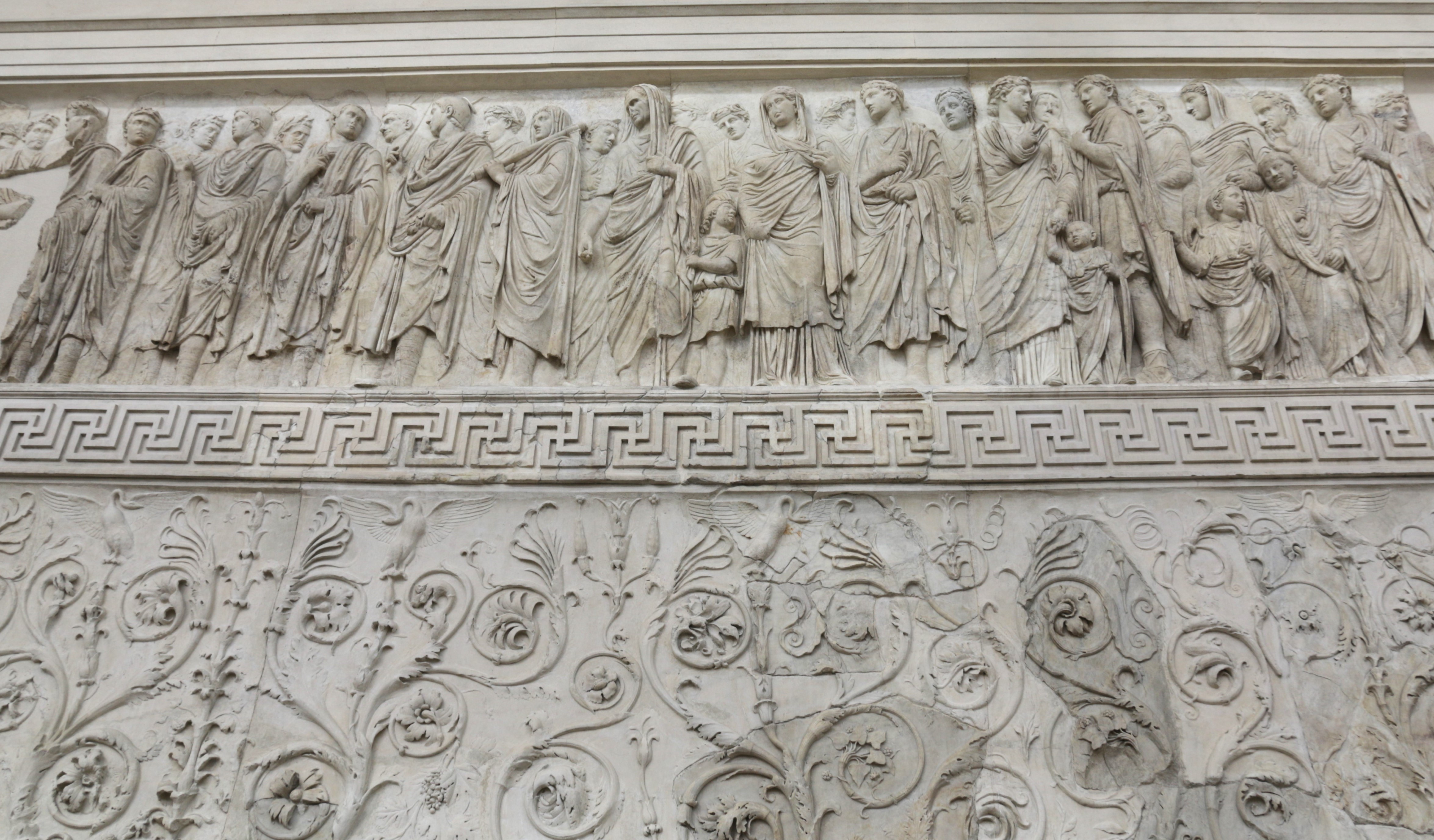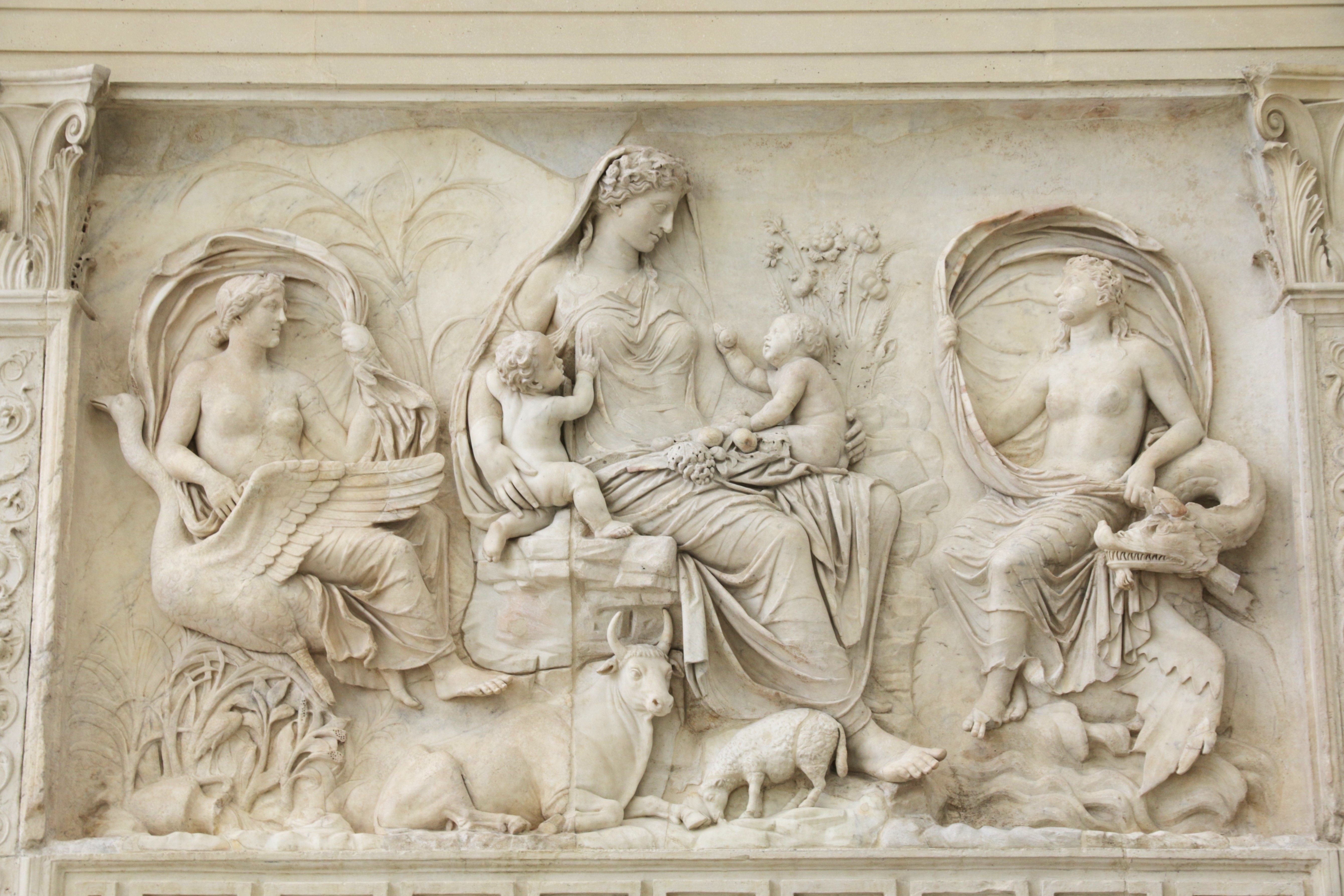 По всему периметру ограждения алтаря, на первом ярусе, проходит растительный орнамент с лебедями. Лебедь считался священной птицей Аполлона, который, в свою очередь, был покровителем Августа - отсюда и такое птичье изобилие.