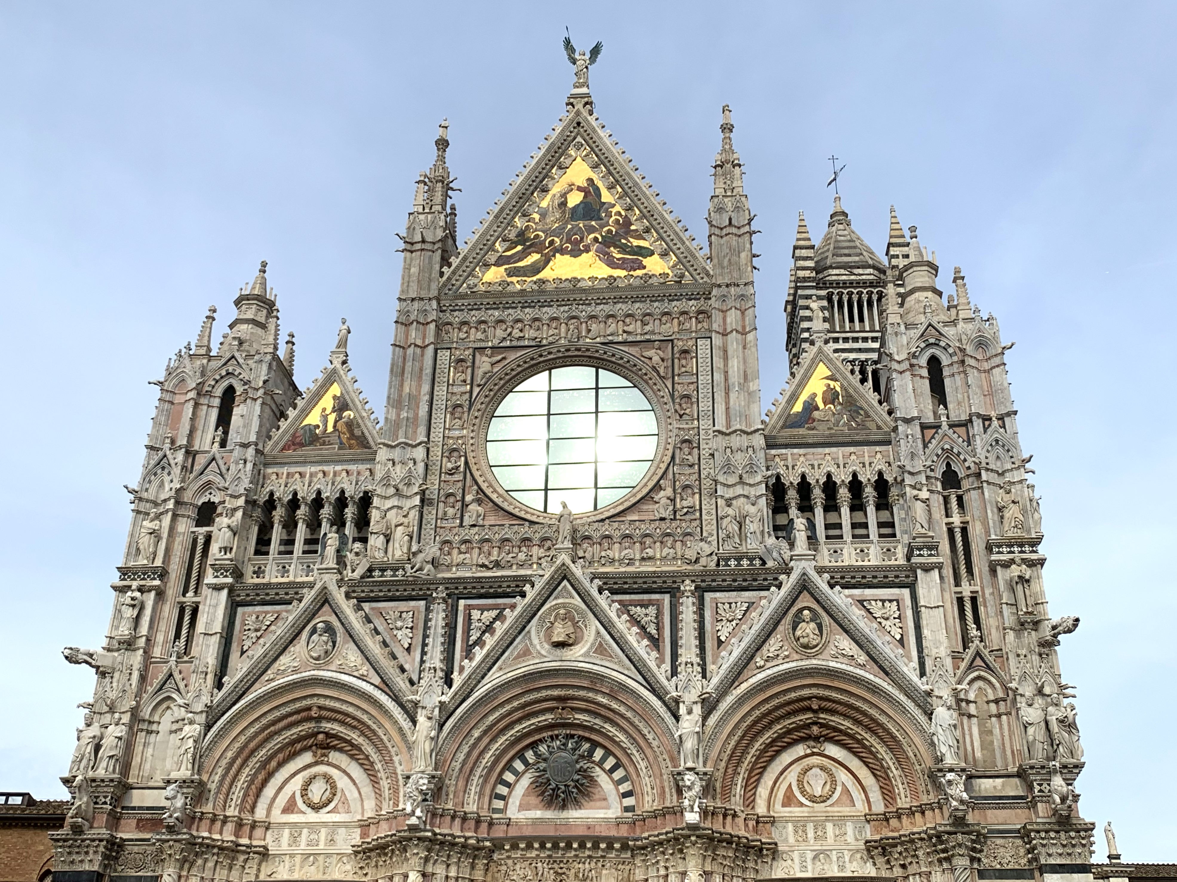 Дуомо Сиены, освящённый в честь Вознесения Девы Марии (итал. Cattedrale di Santa Maria Assunta), расположен на одноимённой площади в центре города. Он построен на месте первого кафедрального собора во имя Девы Марии, в свою очередь возведённого на развалинах римского храма, посвященного Минерве. Этакий сиенский вариант римской Санта-Мария-сопра-Минерва:), что рядом с Пантеоном.