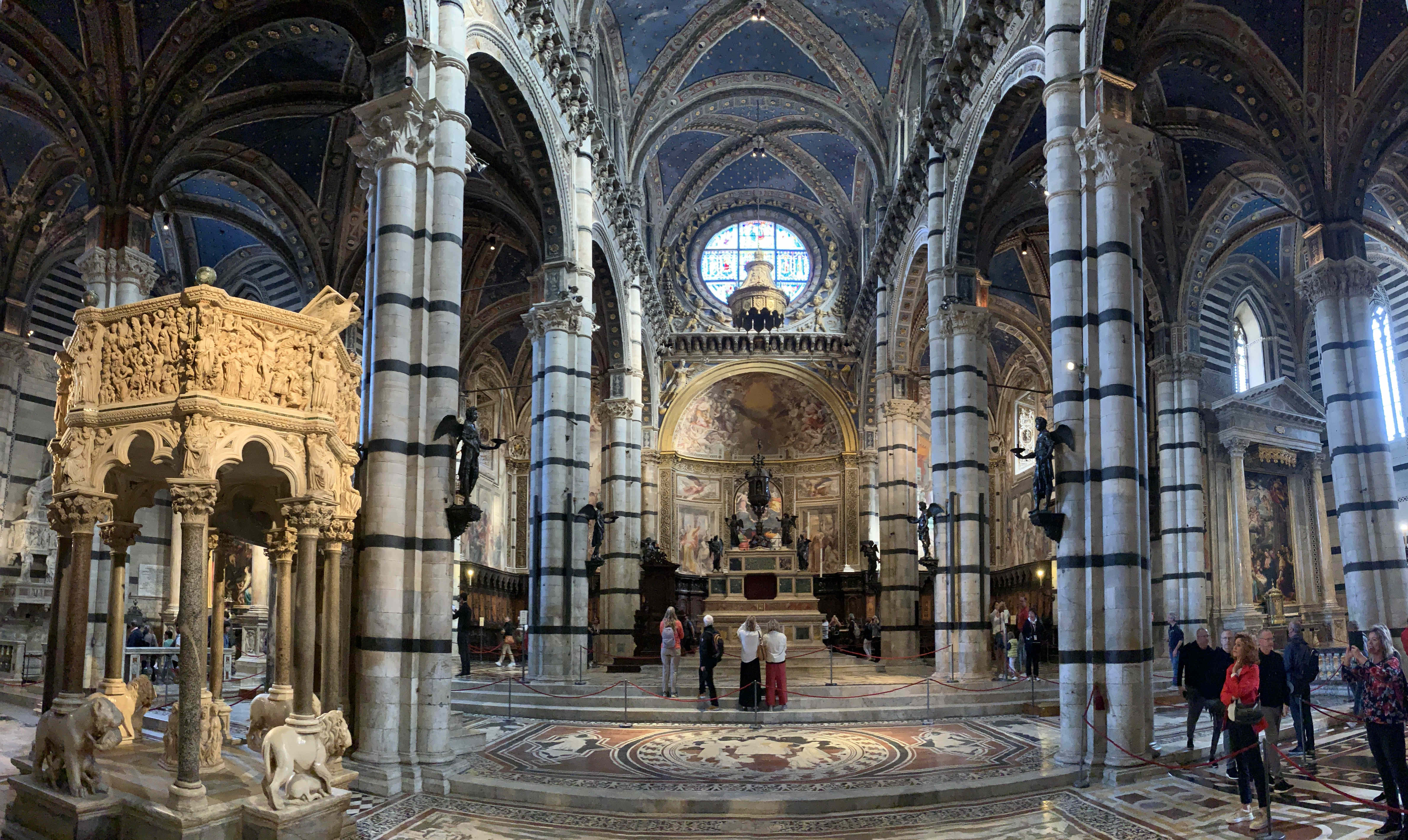 Самым большой достопримечательностью собора считается его уникальный мозаичный пол. Он разделен на 56 панелей различного размера и формы с изображениями библейских сюжетов, сивилл, аллегорических фигур. Первые из имеющихся изображений относятся примерно к 1370 году. Работы продолжались различными художниками (из которых наиболее известные - Маттео ди Джованни, Пинтуриккьо, Джованни ди Стефано, Доменико Беккафуми) и были завершены в середине 16-го века. В 1878 г. нескольких панно были фактически воссозданы заново на замену наиболее вытоптанным.