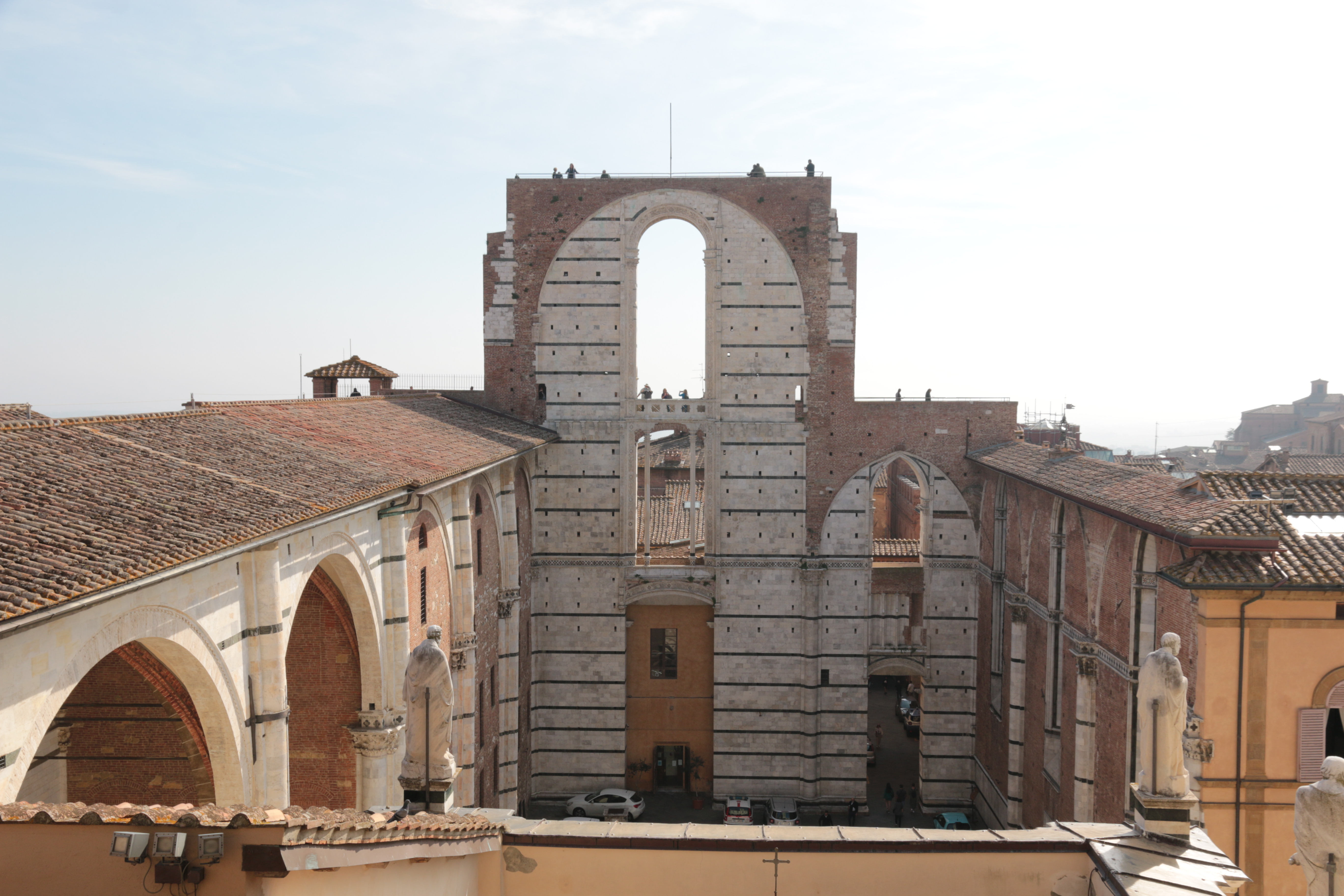 Построив к началу 14-го века огромный собор, сиенцы решили не ограничиваться достигнутым и захотели превратить свой Дуомо в настоящего гиганта. Для этого они начали в 1339 году возводить новый храм, для которого существующий должен был стать поперечным трансептом. Строительство продолжалось до 1348 года, когда оно было прервано эпидемией чумы и больше уже не возобновлялось. К тому же впоследствии обнаружили конструктивные ошибки, что заставило разобрать своды северного нефа. Южный неф сохранился и занят сегодня музеем собора. Сохранилась также и гигантская фасадная стена «нового» собора, прозванная Facciatone («фасадище»).
