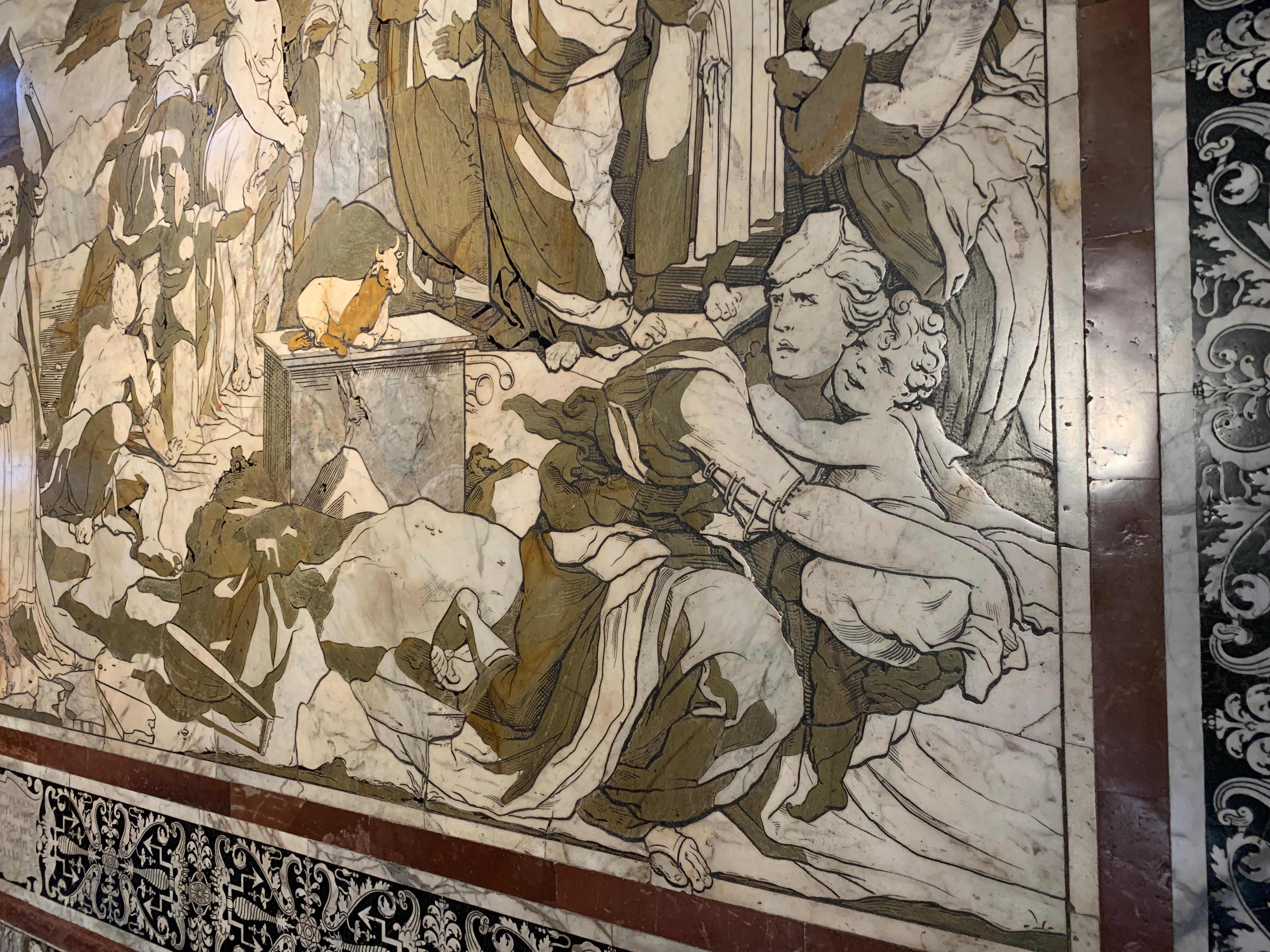 Мозаичные полы собора в целях их сохранности обычно укрывают, их открывают только на 2 месяца в году: с конца августа до конца октября, приурочивая это к Палио, проводимому 16 августа. Поскольку мы были в Сиене в октябре, нам посчастливилось увидеть полы собственными глазами.