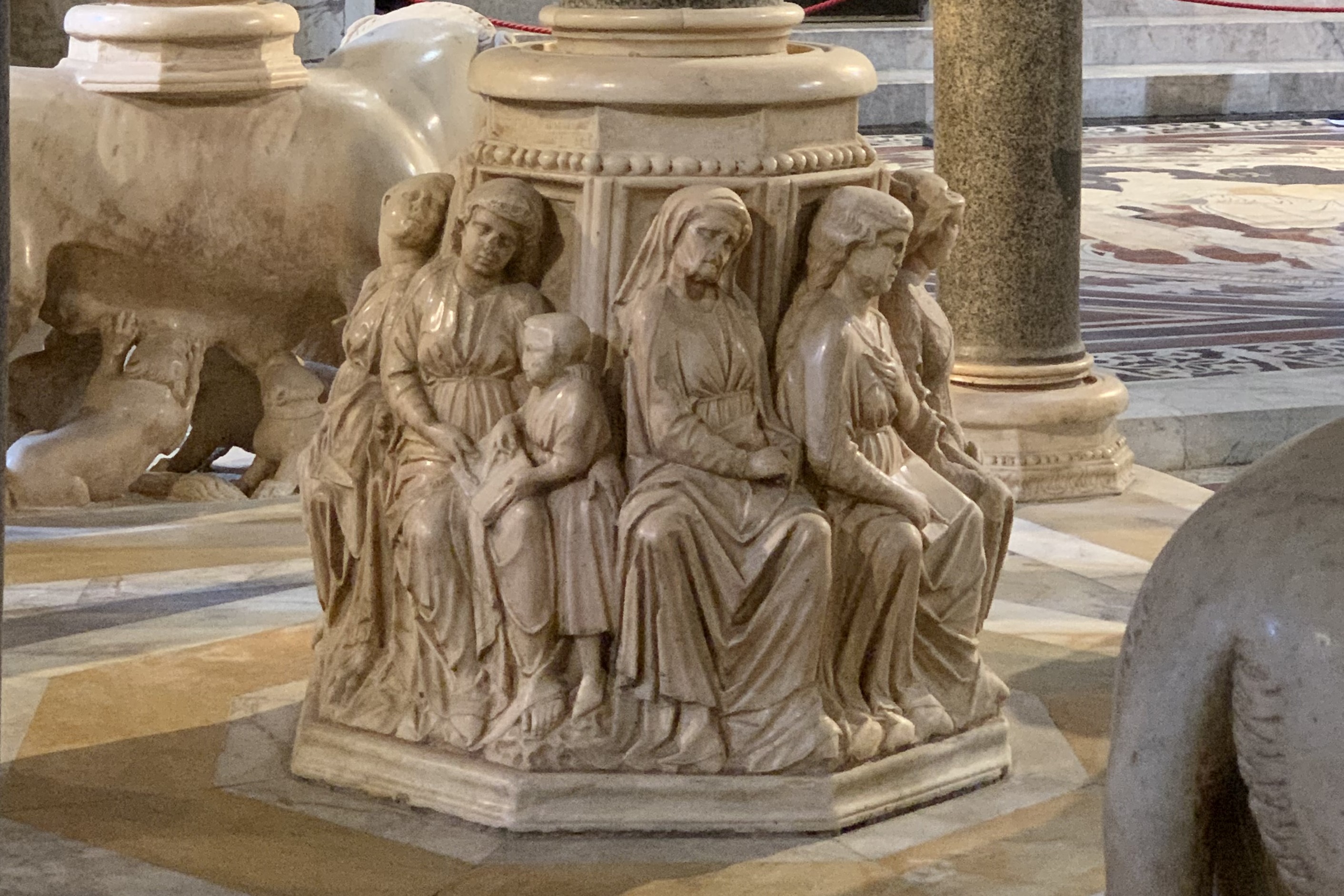 Жемчужиной Дуомо, которую иногда называют самой главной готической скульптурой Италии, является соборная кафедра (Pulpito), над которой в 1265-1268 гг. работали три выдающихся мастера той эпохи: Николо Пизано с сыном Джованни и Арнольфо ди Камбио. Восьмиугольная кафедра поддерживается девятью колоннами, причём четыре из них опираются на фигуры львов и львиц. Над капителями колонн — фигуры, олицетворяющие основные добродетели и логику, а верхний ярус кафедры огражден балюстрадой с семью рельефами на темы жизни Христа.