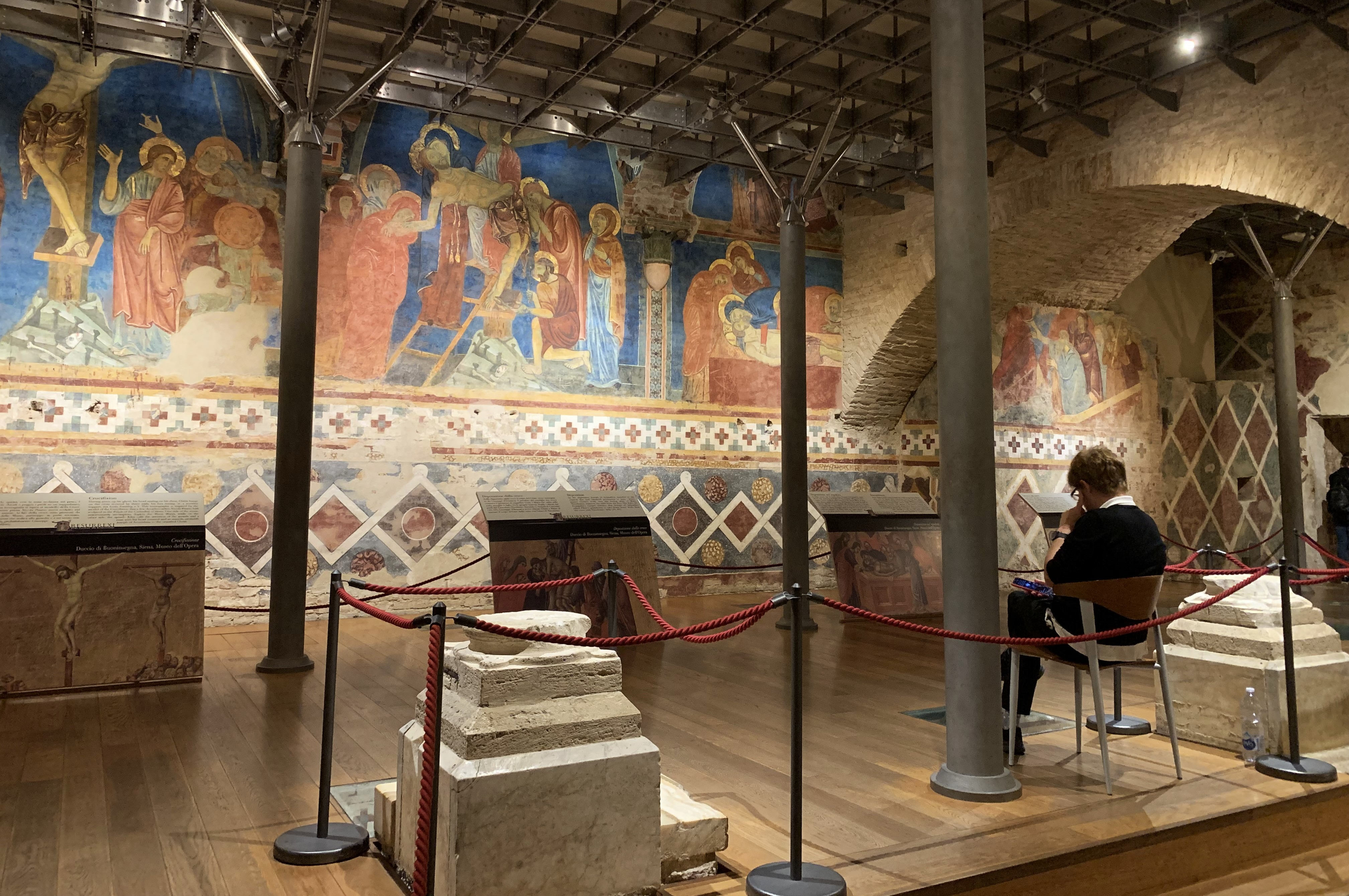 На самом почетном месте в музее - работы сиенского мастера Дуччо ди Буонинсенья, или просто Дуччо (ок.1255-1319). Его справедливо считают истинным основоположником сиенской художественной традиции, который, выйдя за пределы традиционной византийской иконописи, существенно обновил художественный язык живописи. Именно работы Дуччо считают началом постепеннного перехода от статичности византийского письма - через готику - к искусству Ренессанса.