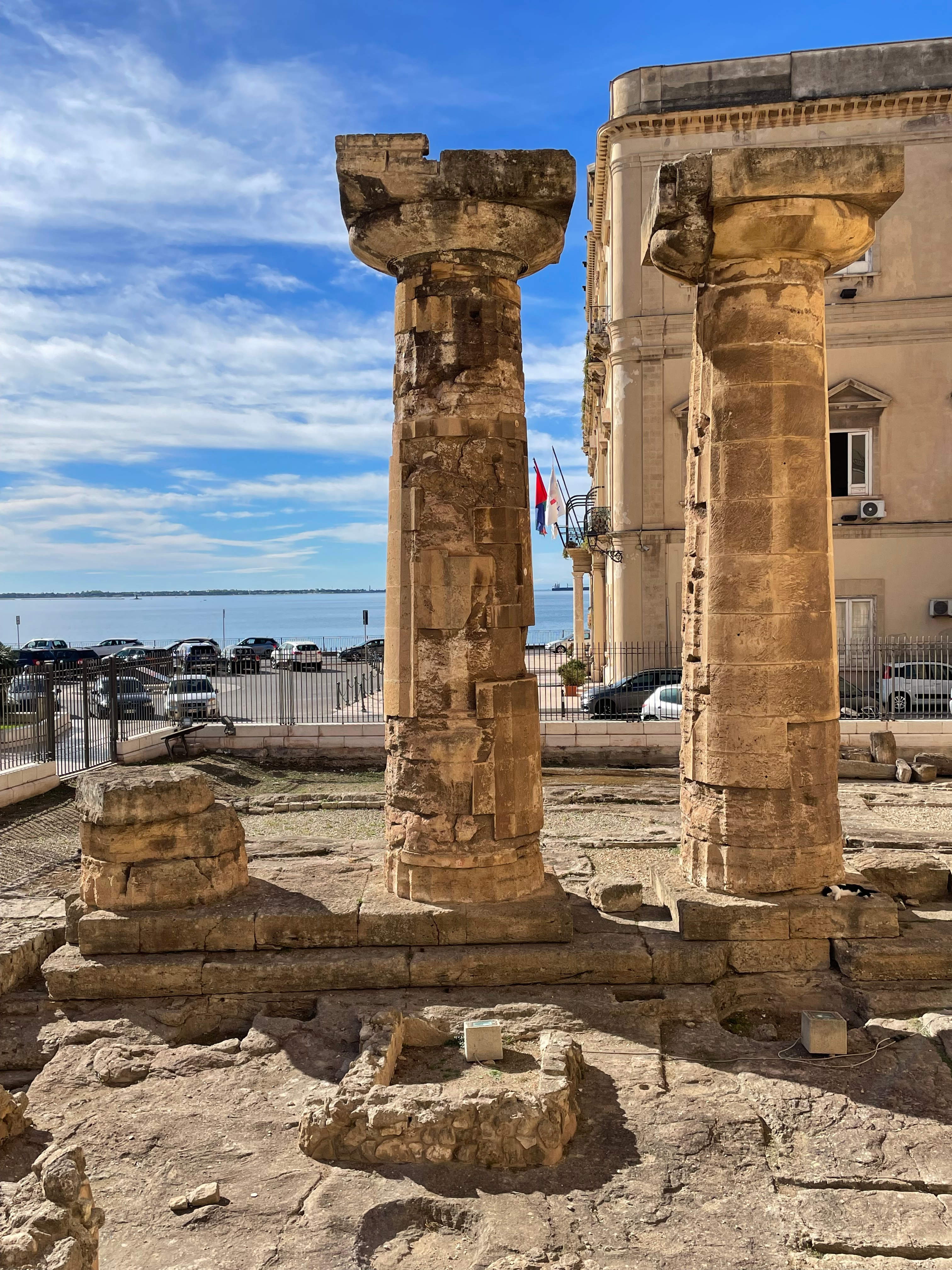 Фото 5ab. Эти колонны были частью храма Посейдона эпохи Великой Греции и могут быть датированы началом 6-го века до н.э. В храме Посейдона было шесть или восемь колонн на короткой стороне и пятнадцать или семнадцать - на длинной; до наших дней дошли только две колонны и часть третьей. Как пишут, это самые старые греческие руины не только в Таранто, но и во всей Великой Греции.