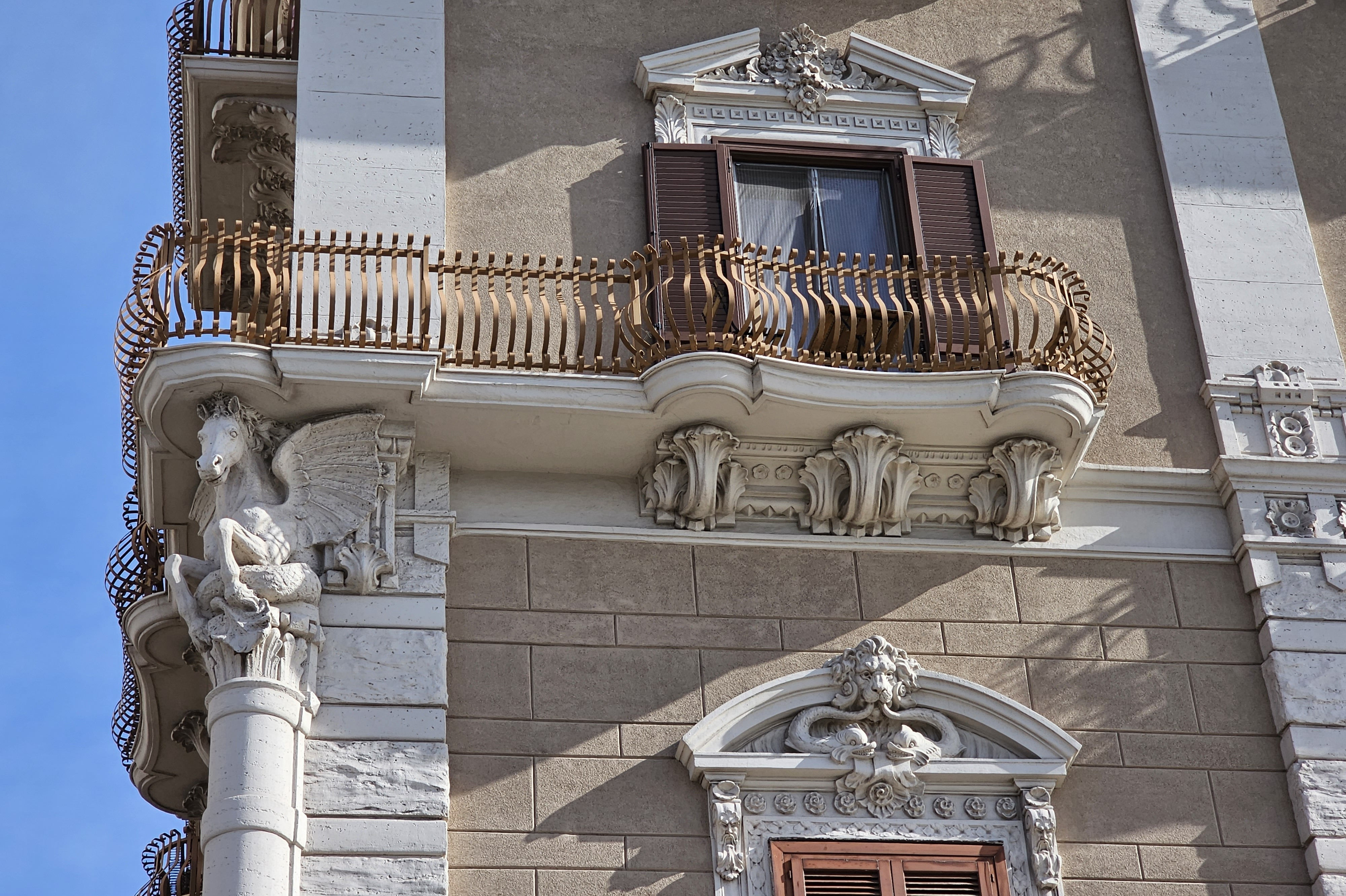Фото 55ab. Дворец правительства. На фасаде - грандиозная лоджия с двумя бронзовыми орлами, размещенными на цилиндрических постаментах, а по бокам главного входа можно увидеть рельефы с обнаженными фигурами. Стремление показать преемственность с Древним Римом очевидно!