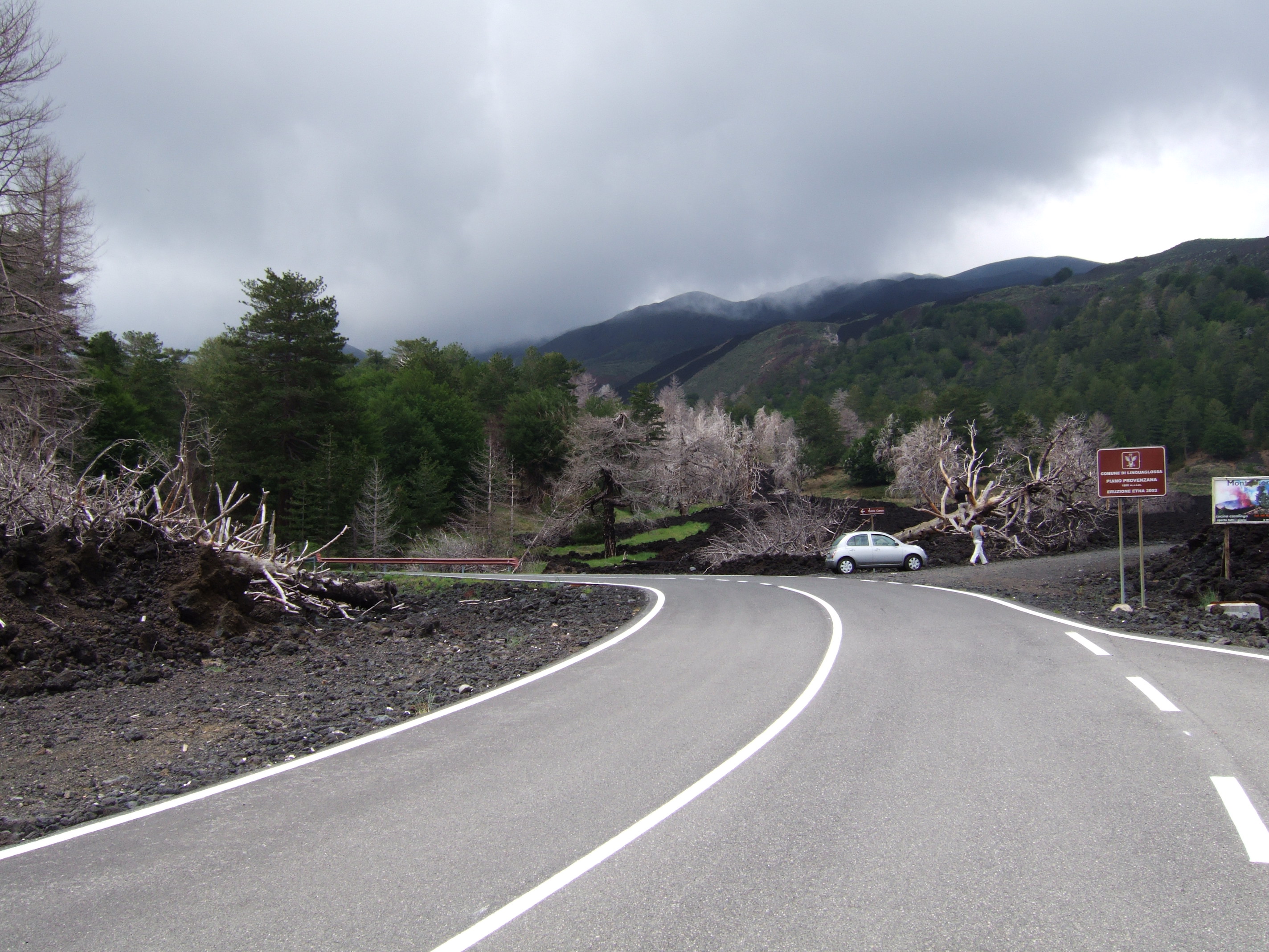 Гора Этна, высотой около 3300 м, является одним из крупнейших в Европе действующих вулканов. Из кратера постоянно идёт дым (фото 9), а извержения происходят довольно часто, поэтому склоны Этны покрыты чёрными лавовыми полями. Поднявшись туда, сталкиваешься с совершенно сюрреалистическими "лунными" пейзажами (фото 10-17), которые на научном языке называются "вулканической пустыней".