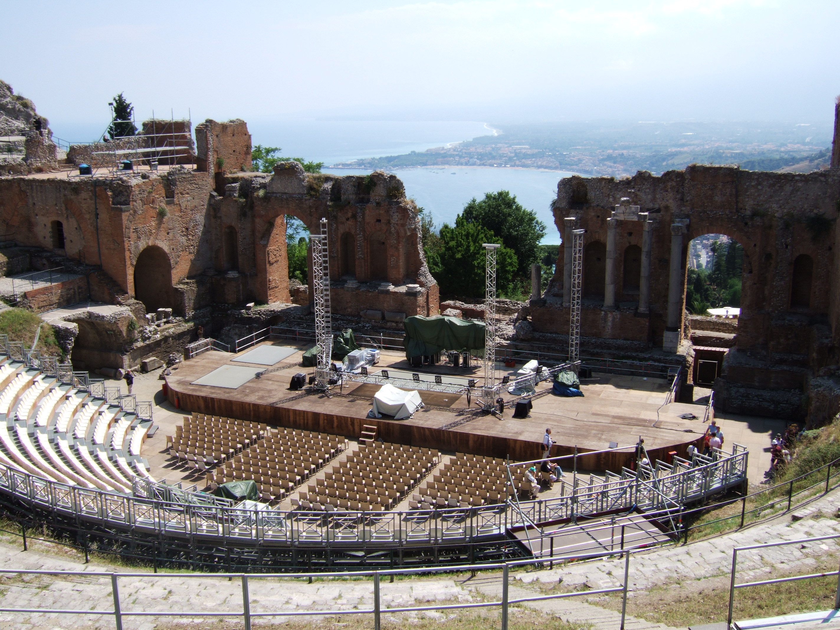 Таормина расположена на горной террасе, нависающей над морем на высоте 200 м. Когда-то внизу была основана первая греческая колония на Сицилии (Нассо), а наверху греки построили театр (фото 1-2), который затем модифицировали и расширили римляне. Театр является главной достопримечательностью города, и от него открываются прекрасные виды на морское побережье и саму Таормину (фото 3-5). В хорошую погоду от театра видна дымящаяся вершина Этны, но нам её не "показали". Город совсем небольшой и очень симпатичный (фото 6-8), летом по нему бродят огромные толпы туристов.