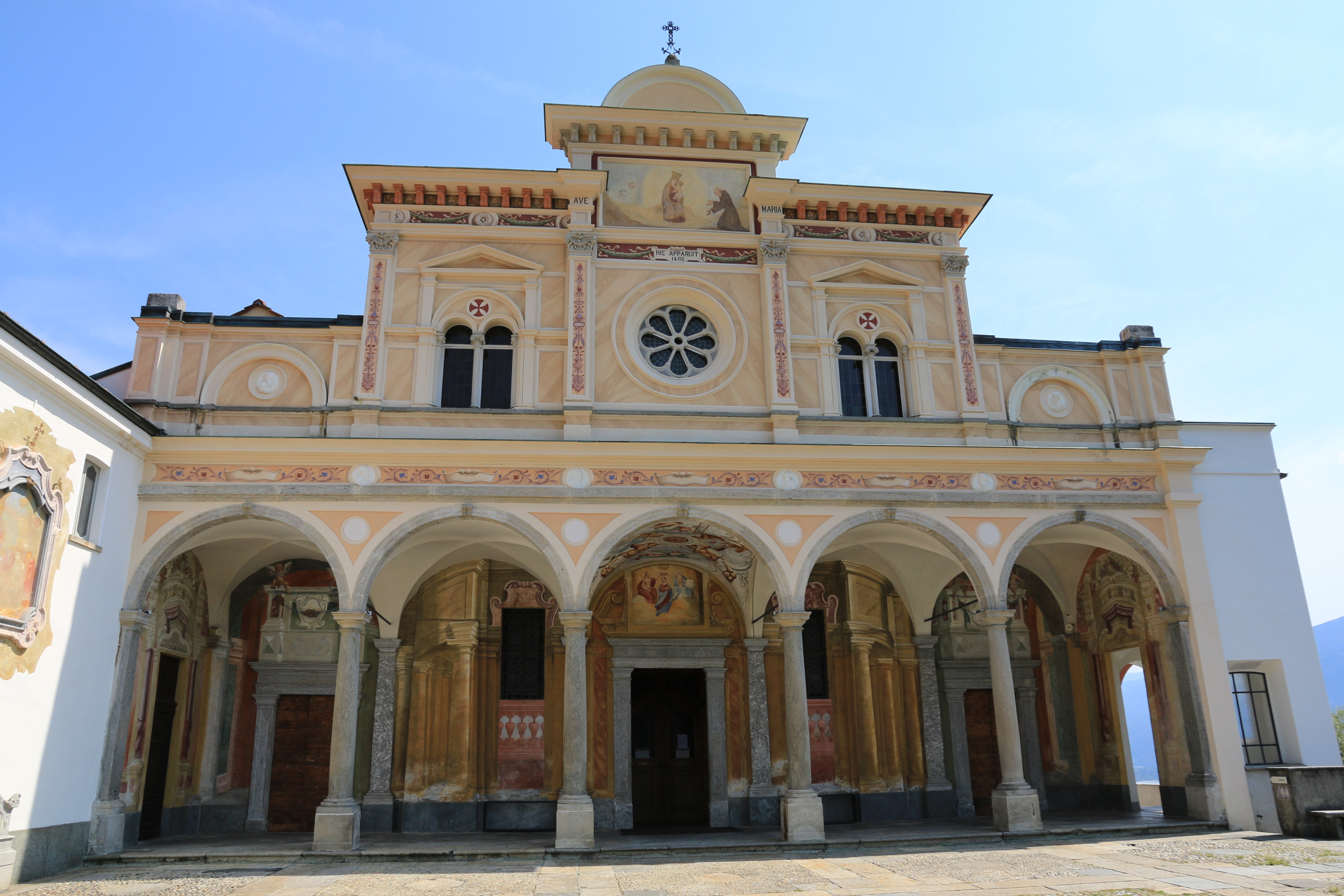 Главная достопримечательность Локарно - церковь Мадонна-дель-Сассо (Madonna del Sasso), в переводе - "Мадонна на скалах" - фото 14-26. Она была сооружена в 1487 году и стоит на скале высотой 350 м прямо над городом; добраться туда можно на фуникулёре от Piazza Grande или пешком вверх по живописной дорожке, как делают паломники. Формально церковь посвящена Благовещенью (La Chiesa dell'Annunciazione).