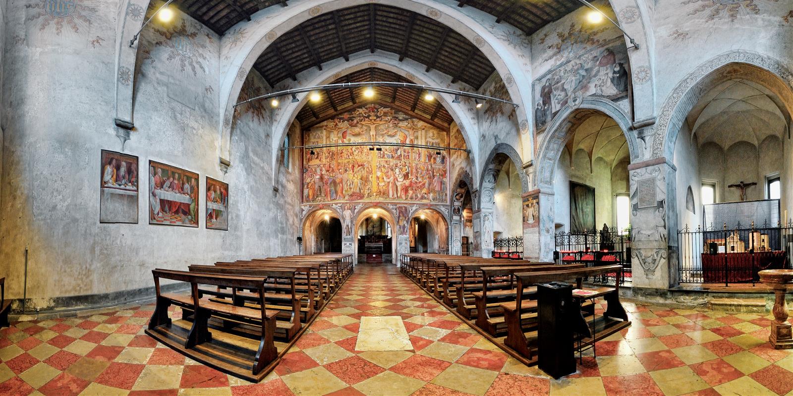 Рядом с замком находится большая трёхнефная францисканская церковь, когда-то бывшая частью монастыря (фото 5-6). Она была построена в начале 13-го века и полностью перестроена в веке 16-м с использованием камней от замка Висконти. Внутри частично сохранились фрески 17-18-го веков, но в плохом состоянии. Кто же над ними так поработал? Свет проливает итальянская Википедия: "После закрытия монастыря в 1848 году, и до 1924 года церковь использовалась как склад и казарма". Что-то очень знакомый сюжет - неужели швейцарцы тоже грешили храмоборчеством???