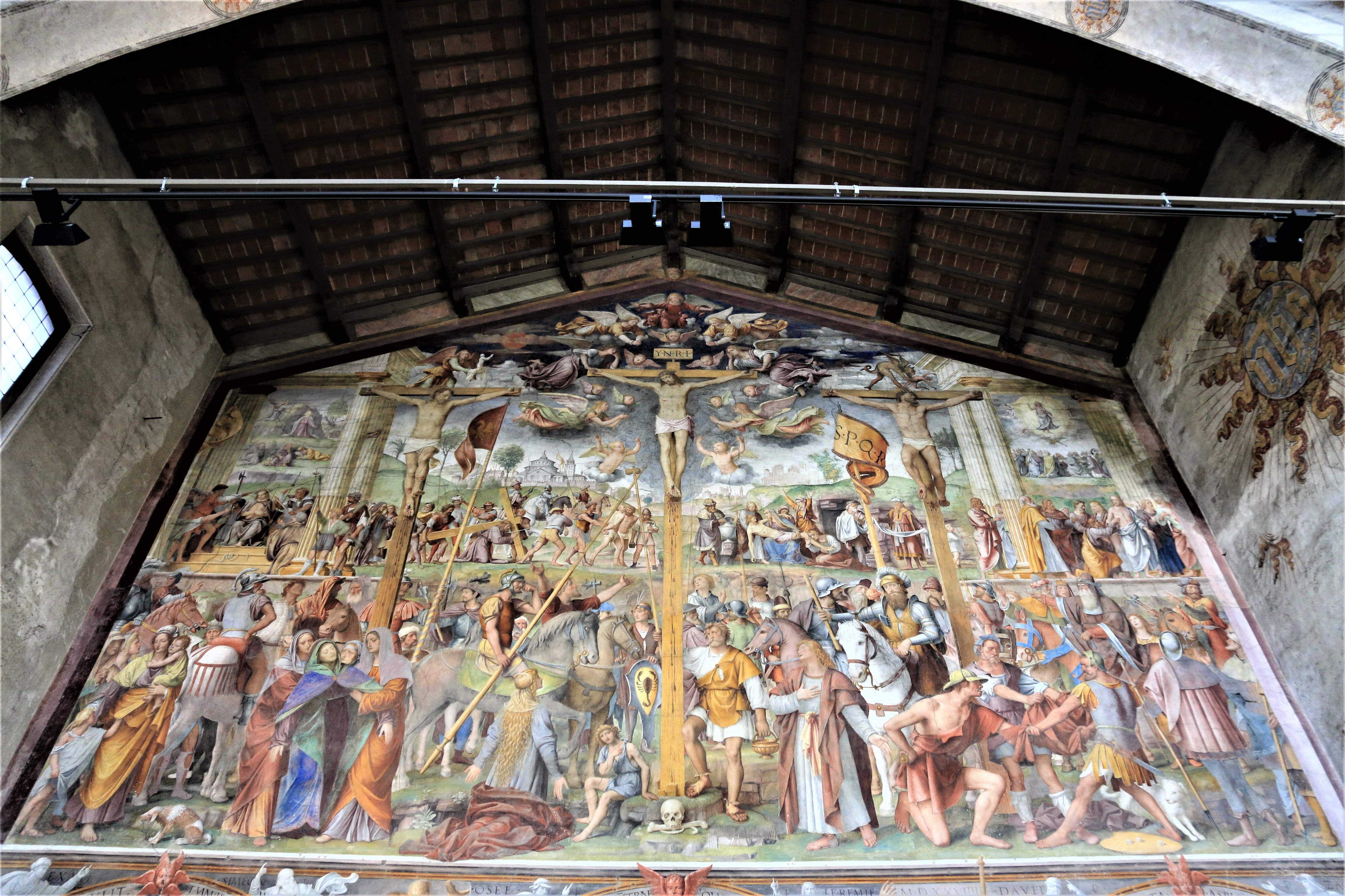 И вот на этой самой перегородке мастер Бернардино Луини нарисовал фреску "Страсти Христовы", которая считается одной из лучших в Швейцарии. Действительно, это настоящий шедевр. Фреска площадью около 100 кв. м была закончена в 1529 г., и мастер Луини работал над ней около 10 лет. В центре композиции - сцена распятия, а сам сюжет развивается как бы на трёх уровнях. В самом низу - очевидцы казни (безутешная Богоматерь, римская стража, солдаты, делящие между собой одежды Христа, просто зеваки). На втором уровне - вся череда Страстей Господних, начиная от моления о чаше в Гефсиманском саду (слева) до эпизода с Фомой неверующим и Воскресением - справа. Наконец, на самом верху ангелы окружили уже умершего на кресте Христа, как бы демонстрируя своё сочуствие. Интересно, что сюжеты и сцены не разделены между собой, а плавно перетекают из одной в другую. В этом усматривают влияние Леонардо да Винчи, впервые применившего такие композиции.